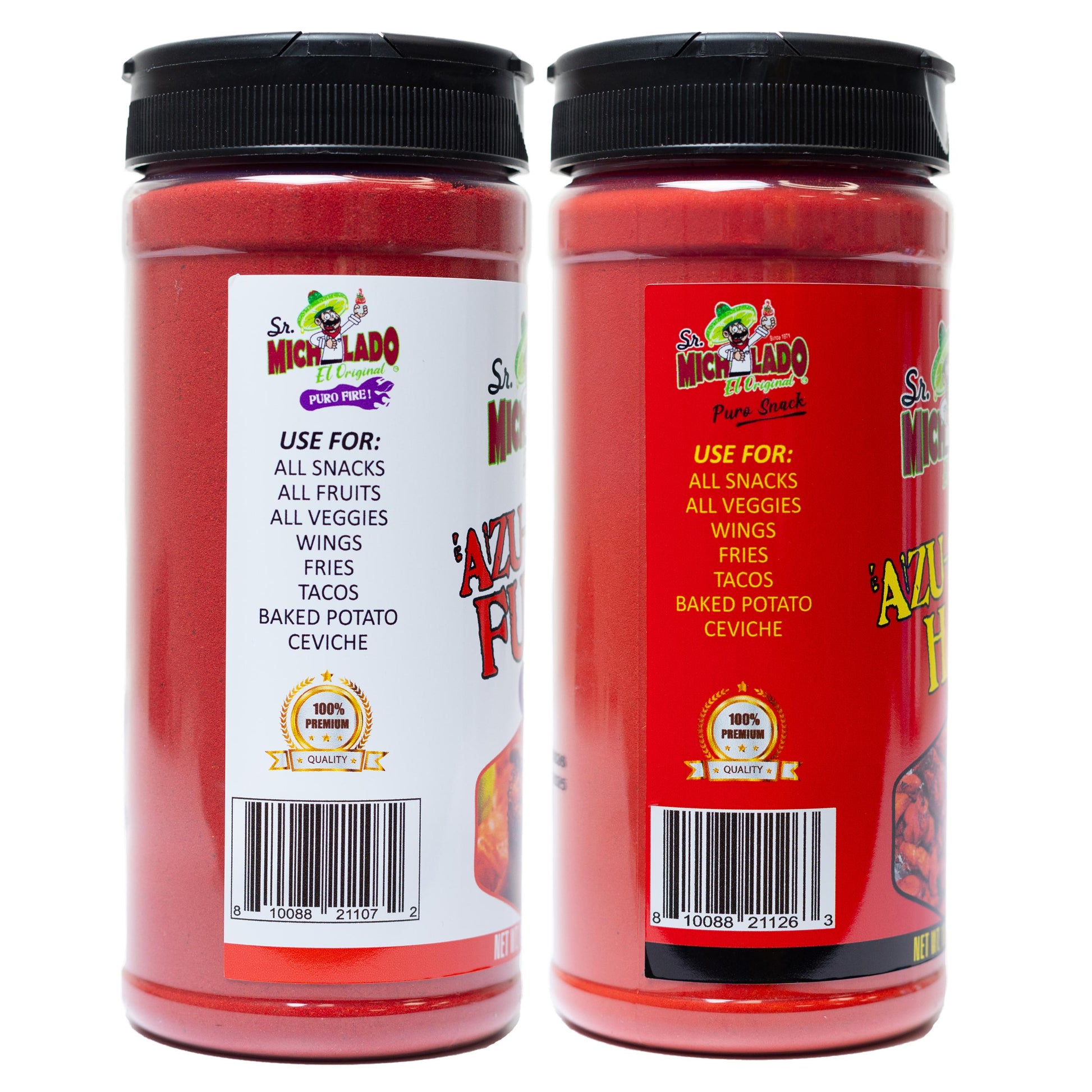 Azu-Mecha COMBO Furia & Hot Snack Seasoning by Sr. Michelado offers a fiery kick. Made with natural and artificial flavors, this seasoning adds bold taste to snacks, fruits, vegetables, wings, fries, and more. Perfect for ceviche and baked potatoes.
