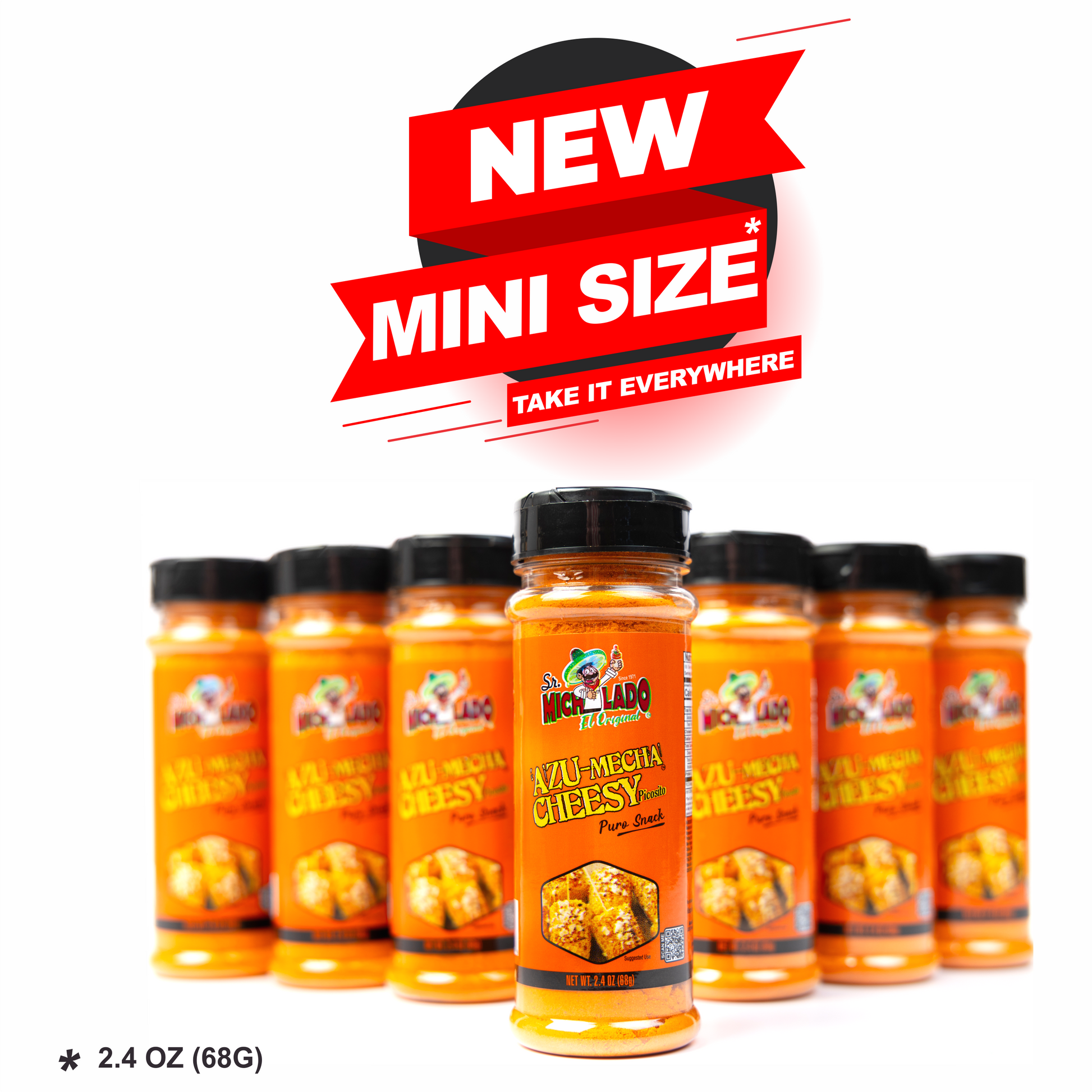 Looking for a fiery kick to spice up your food? Turn up the heat with our NEW MINI Size - Azu-Mecha CHEESY Seasoning (2.8oz) by Sr. Michelado! This travel-friendly size is perfect for on-the-go cravings. It delivers the same bold, spicy flavor you love just CHEESY, now in a smaller package.